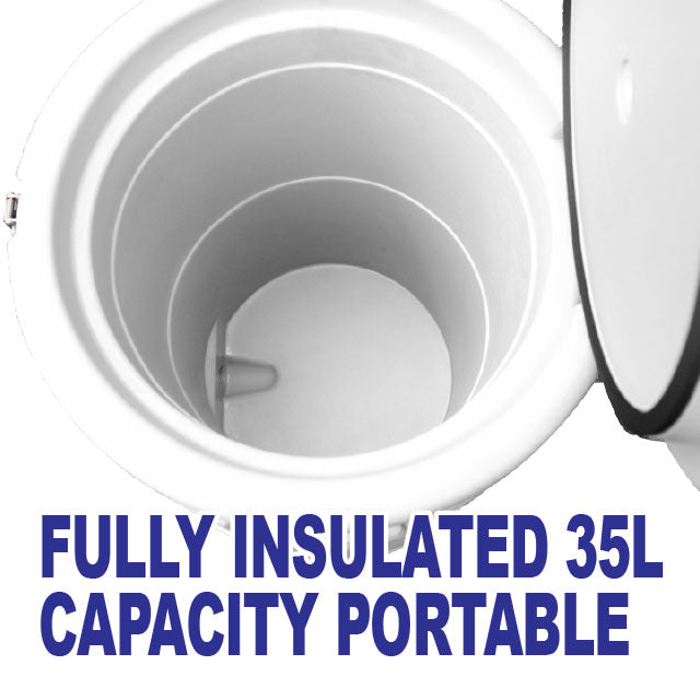 Size 35L External Dimensions 44 cm Diameter x 66.5 cm Height Internal Dimensions 28 cm Diameter x 48 cm Height Outer Casing High density polyethylene Insulation Density High pressure injected Multi compound closed cell PU 35L Capacity Portable Drink Dispenser Heavy Duty Polyethylene construction Fully Insulated with High Density PU High Quality Polypro Handles Stainless Steel Lockable Latches Ideal for Sports Clubs & Outdoor Events Bonus Tap included